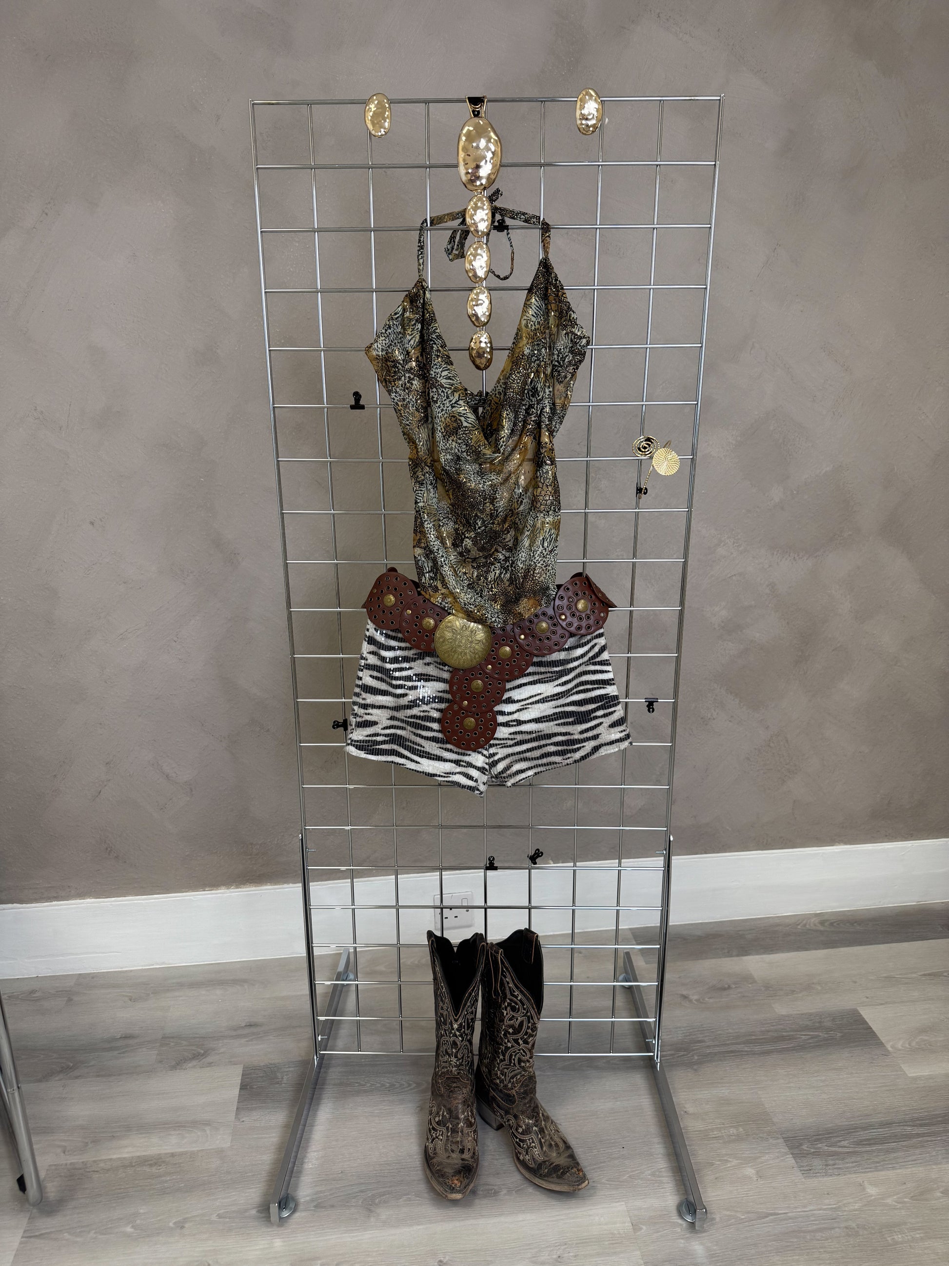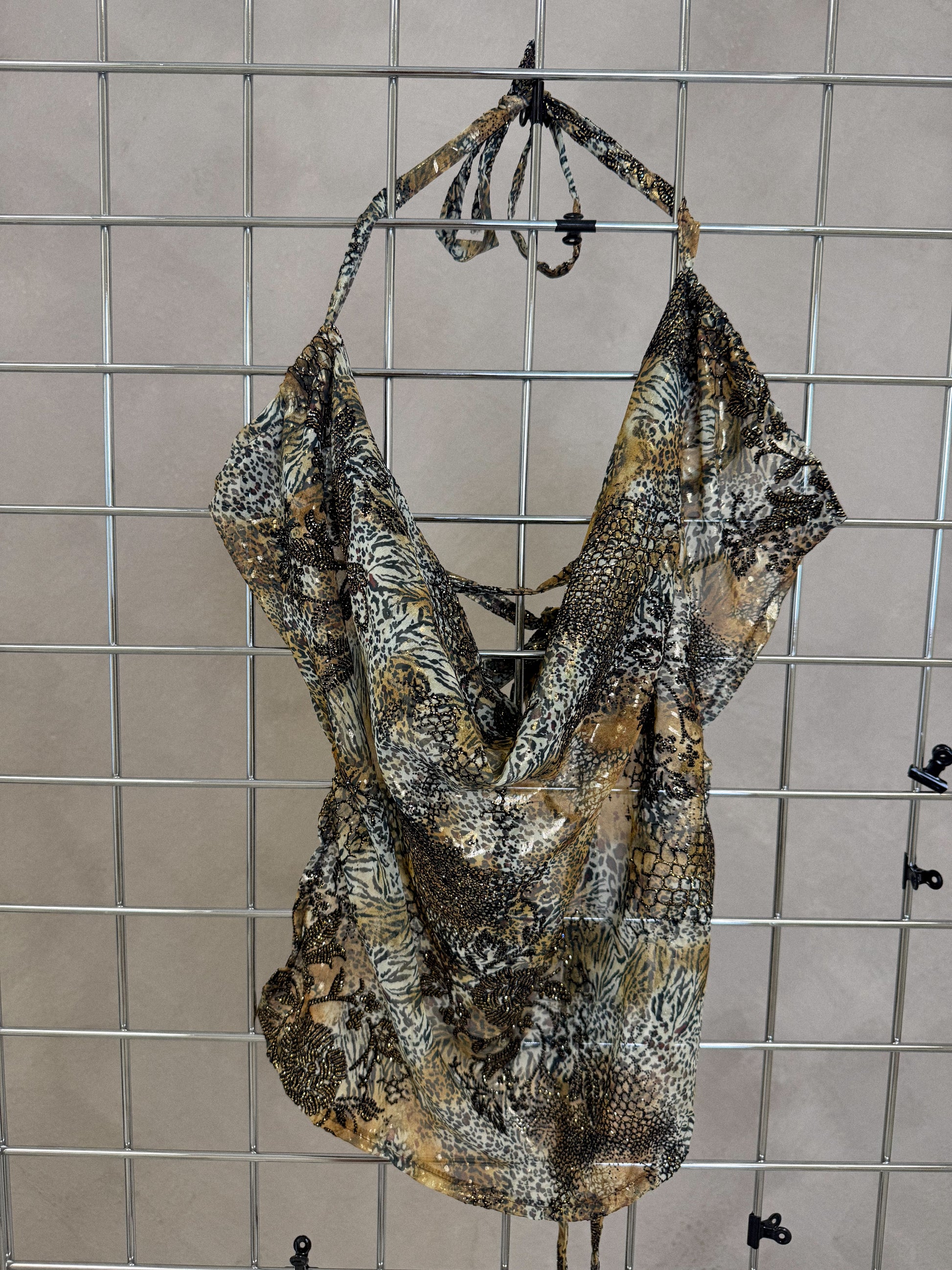 Embellished & shimmer design non stretch fabric with slight cowl neck design. Three two ups on the back for a looser or more cinched appearance!